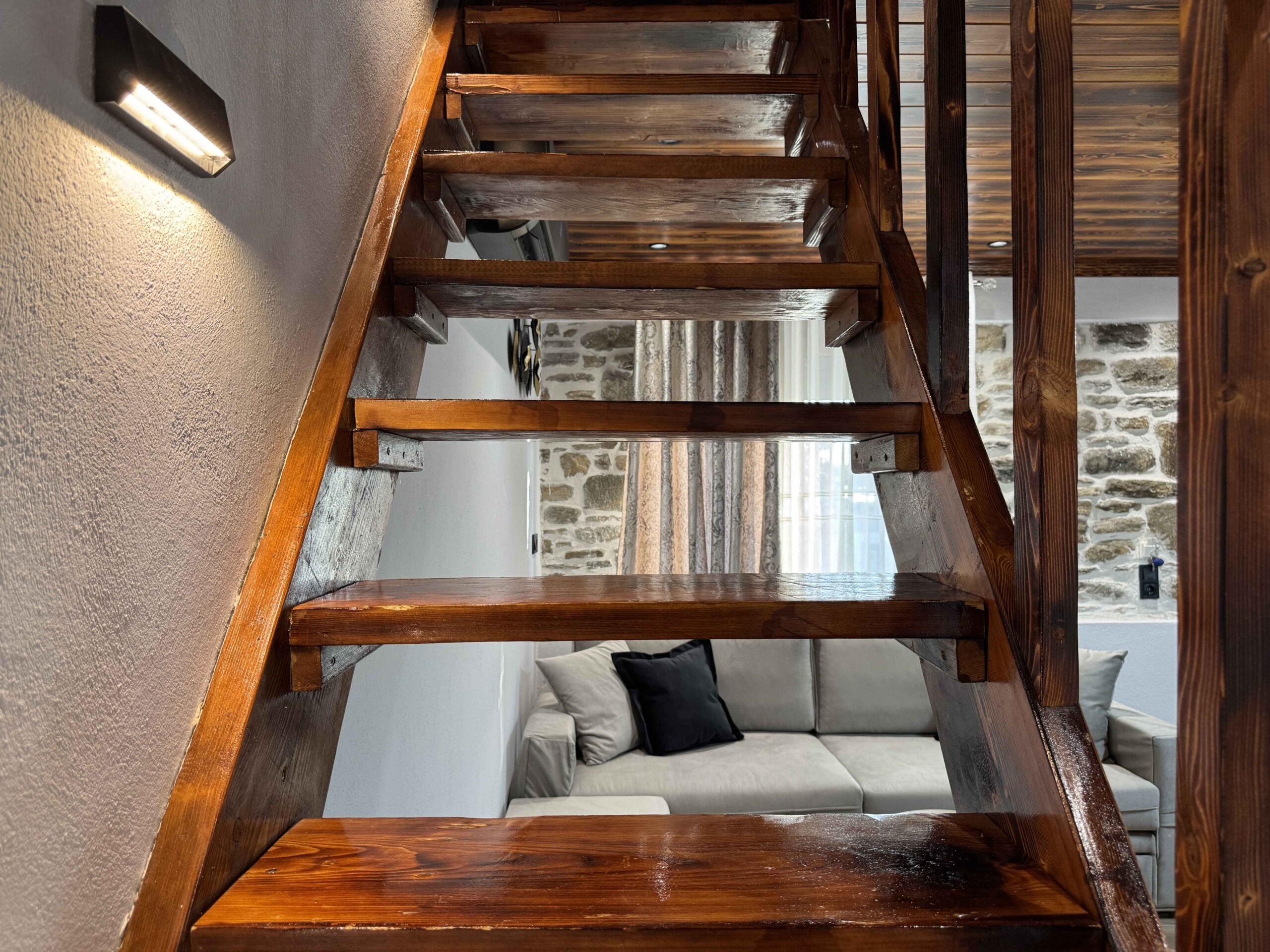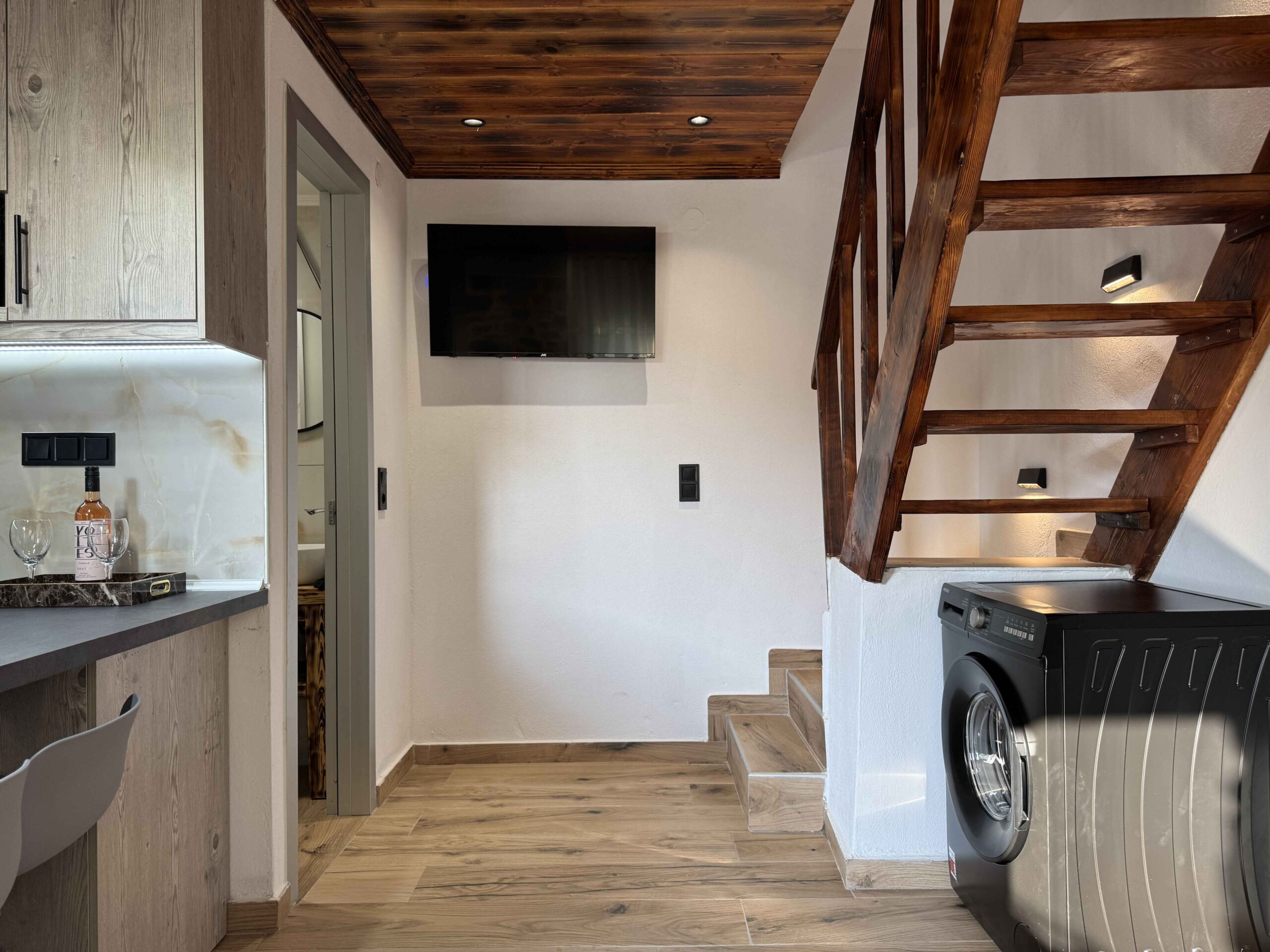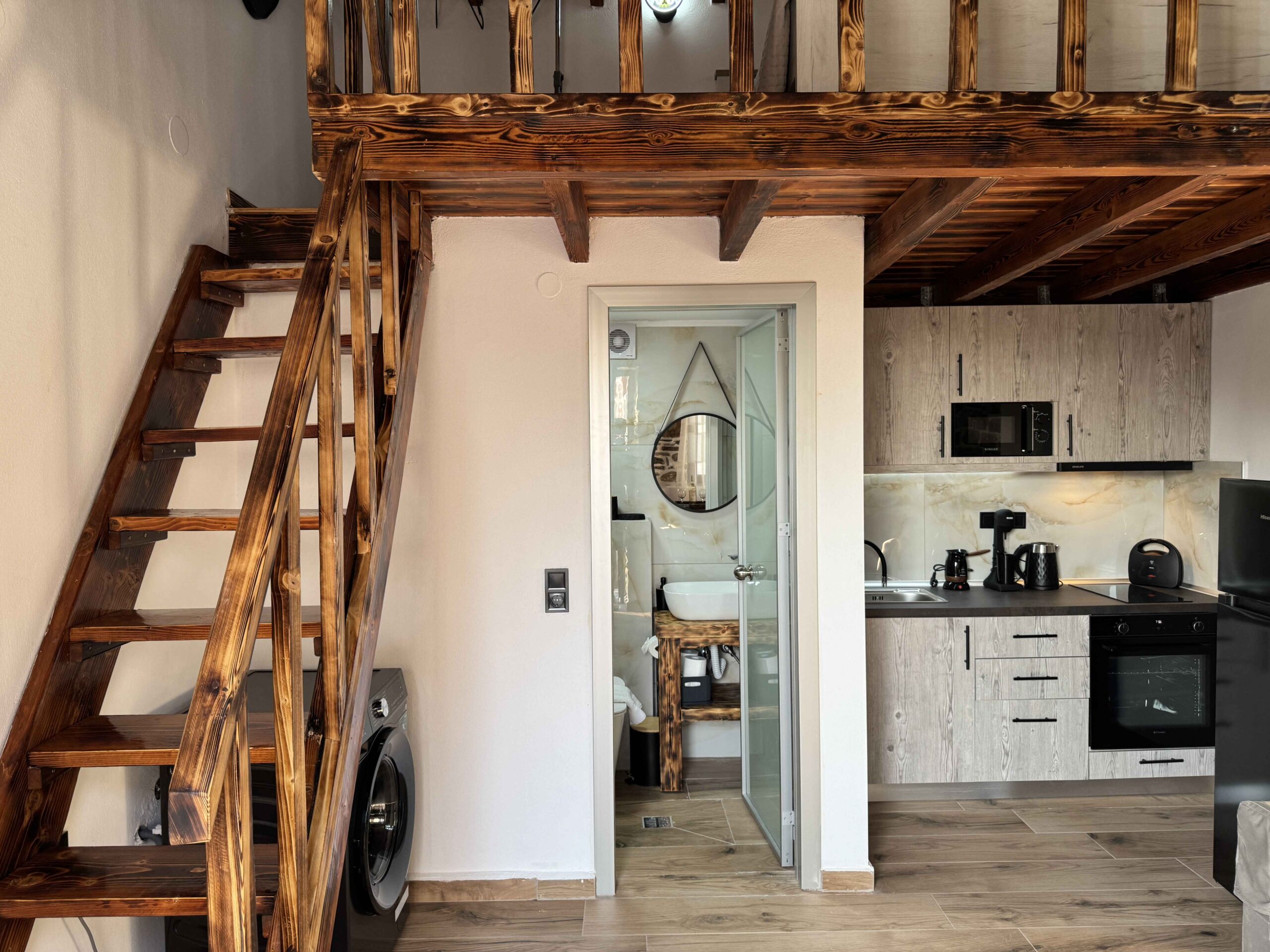 The property includes two independent apartments. Each is arranged over two levels with a different layout. The one-bedroom apartment is spread across two floors, with separate living and sleeping areas. This creates a structured and comfortable space. The maisonette also spans two levels and features an open internal staircase. This gives a more connected and open living arrangement.
