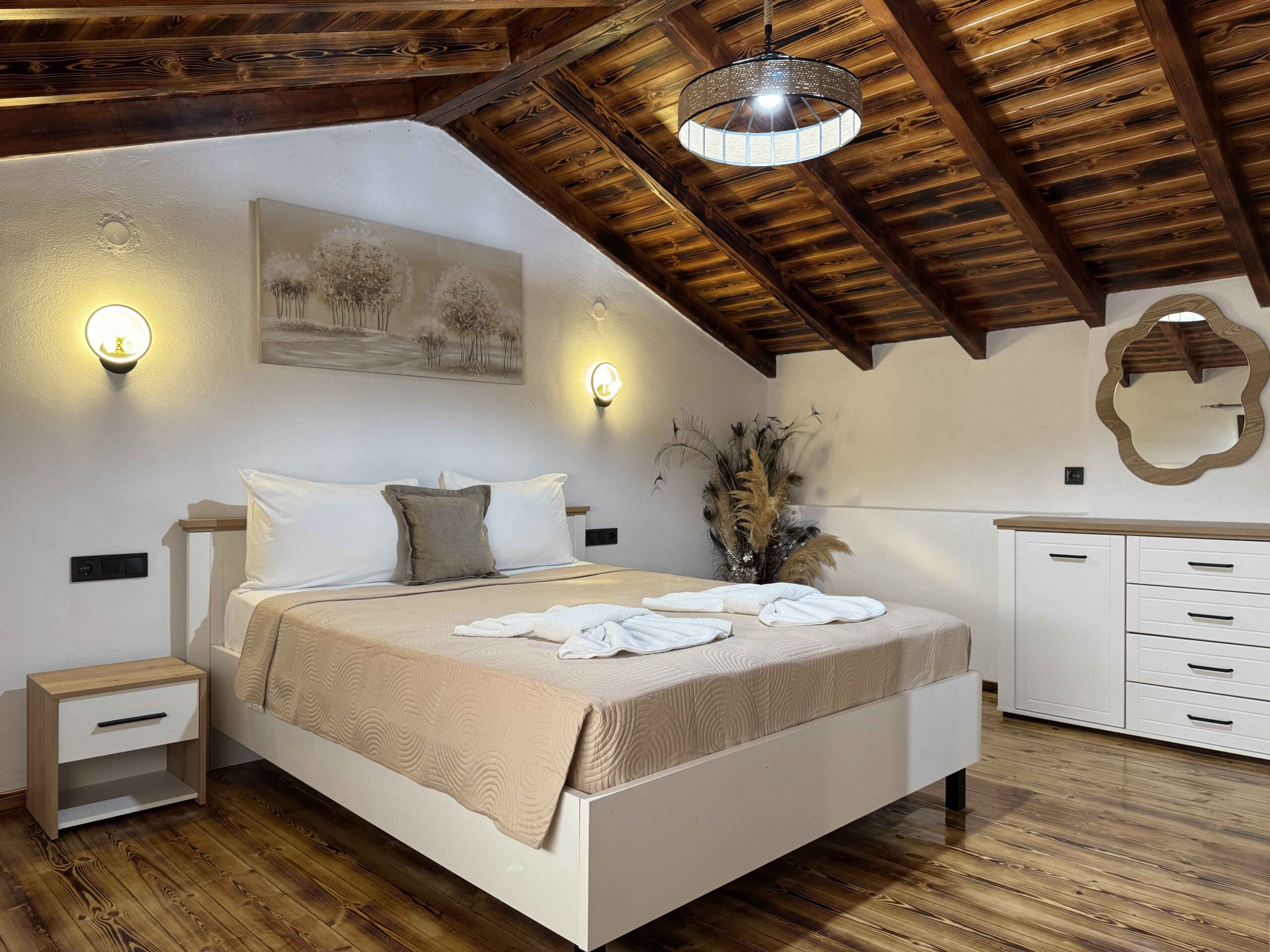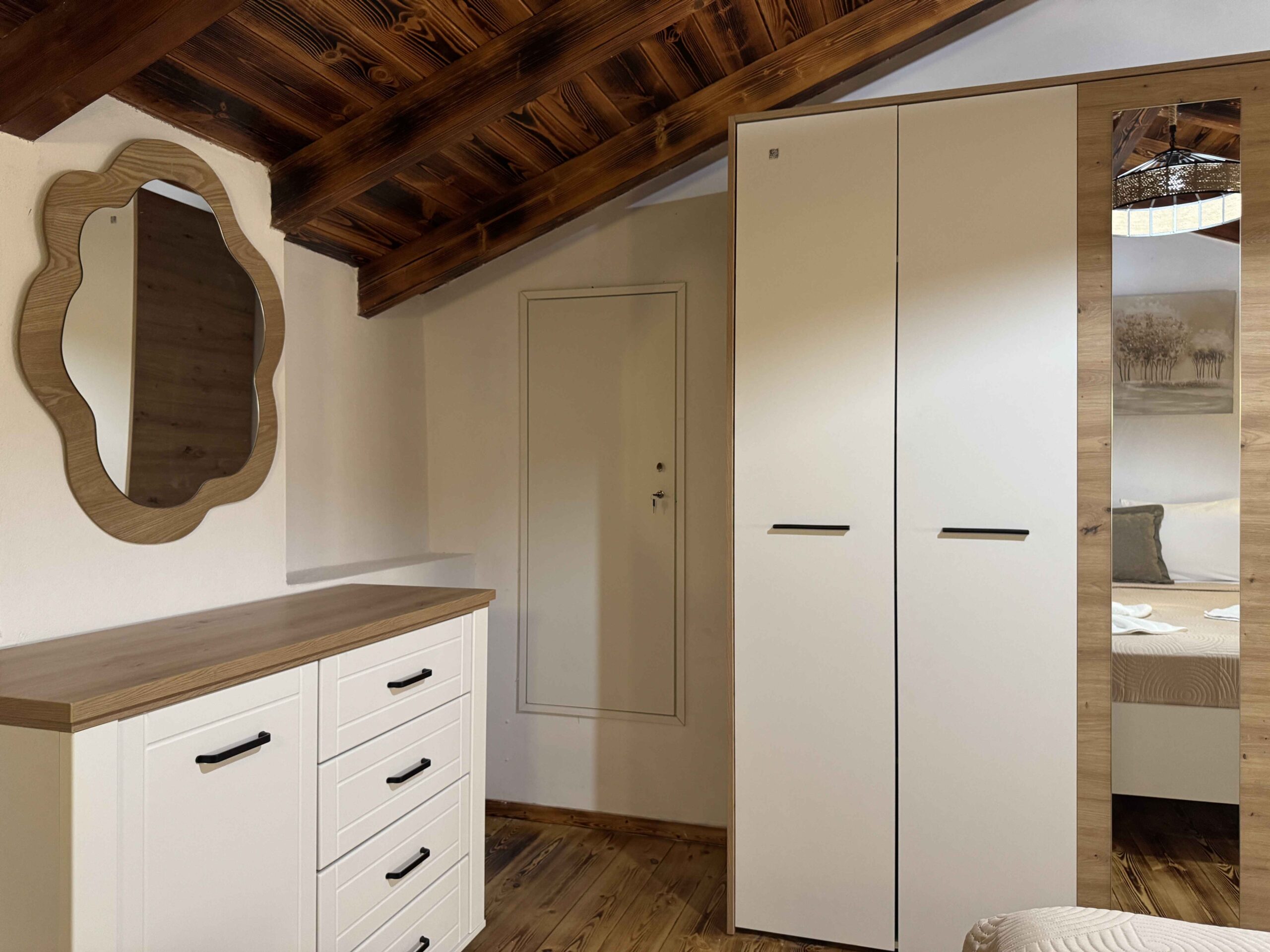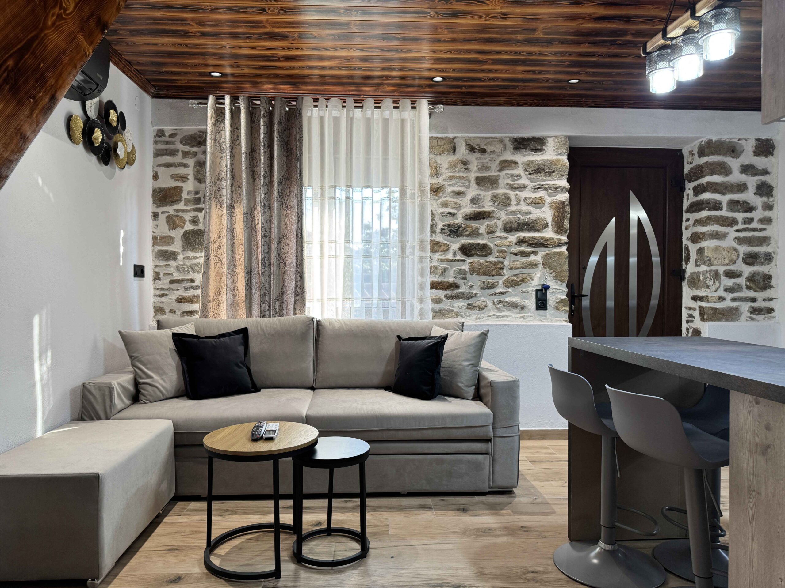 The property includes two independent apartments. Each is arranged over two levels with a different layout. The one-bedroom apartment is spread across two floors, with separate living and sleeping areas. This creates a structured and comfortable space. The maisonette also spans two levels and features an open internal staircase. This gives a more connected and open living arrangement.