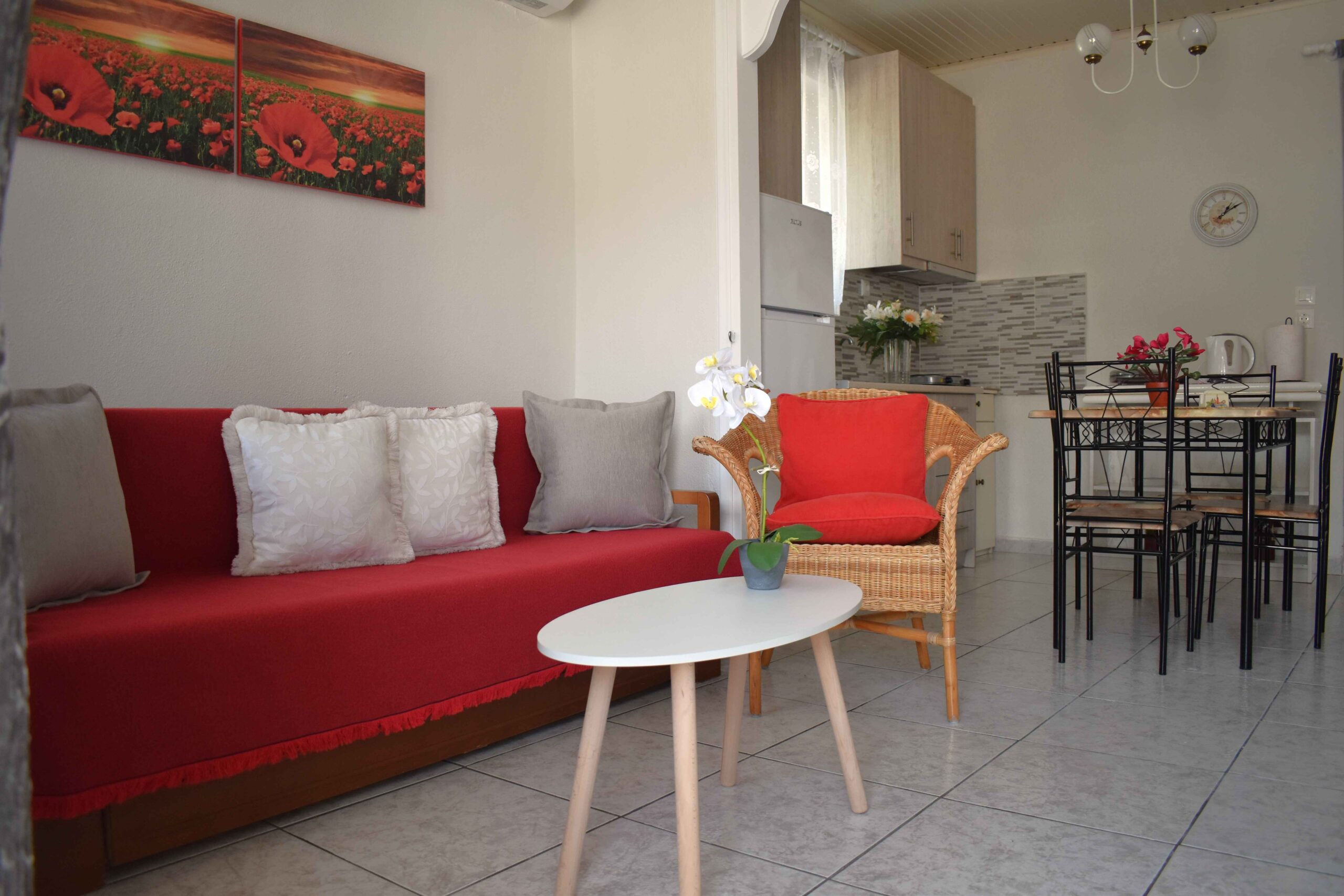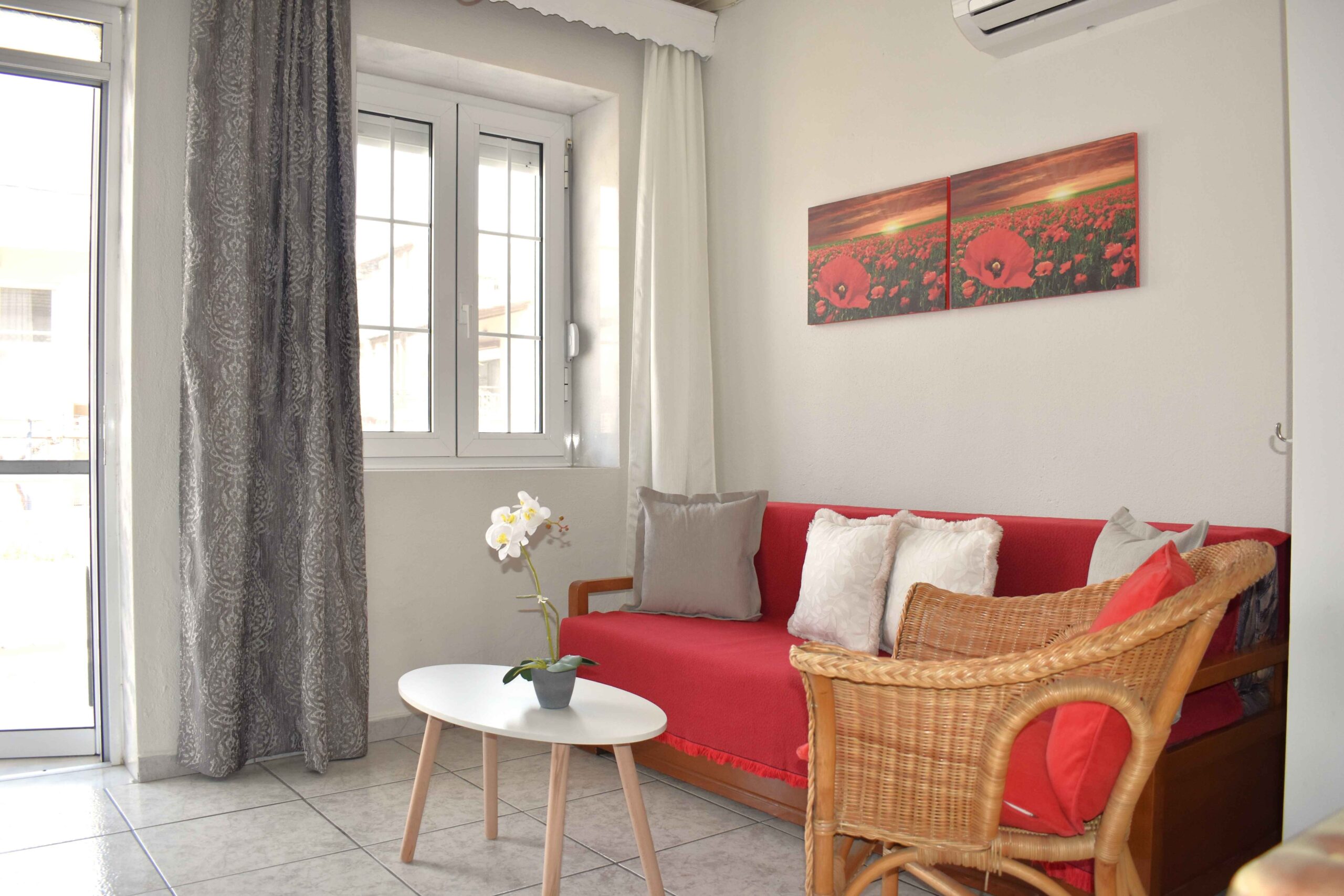 The apartment includes two separate bedrooms, making it a practical choice for families or small groups. A bright living area provides space to relax, while the fully equipped kitchen supports easy self-catered stays. The layout feels simple and functional, offering everything needed for a comfortable holiday in Thassos.