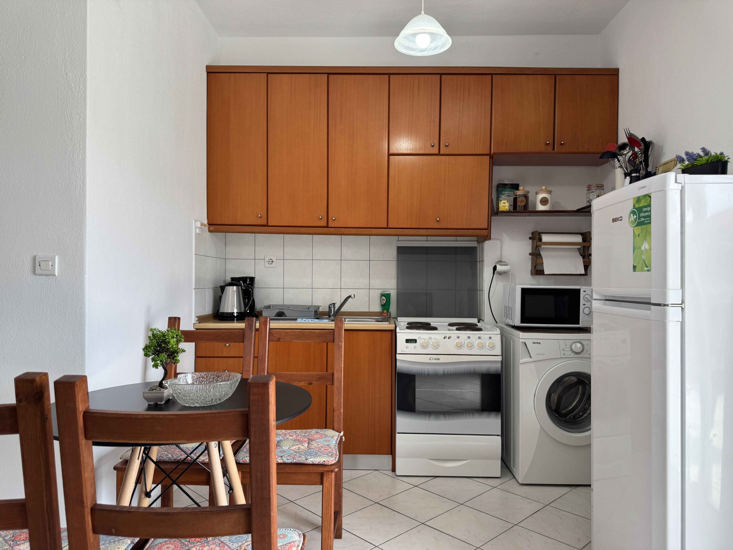 The apartment includes one bedroom, a bathroom, and an open living area with a fully equipped kitchen. As a result, it works well for couples or small families who want a practical and comfortable place to stay. The layout is simple and functional, making it easy to settle in from the start.