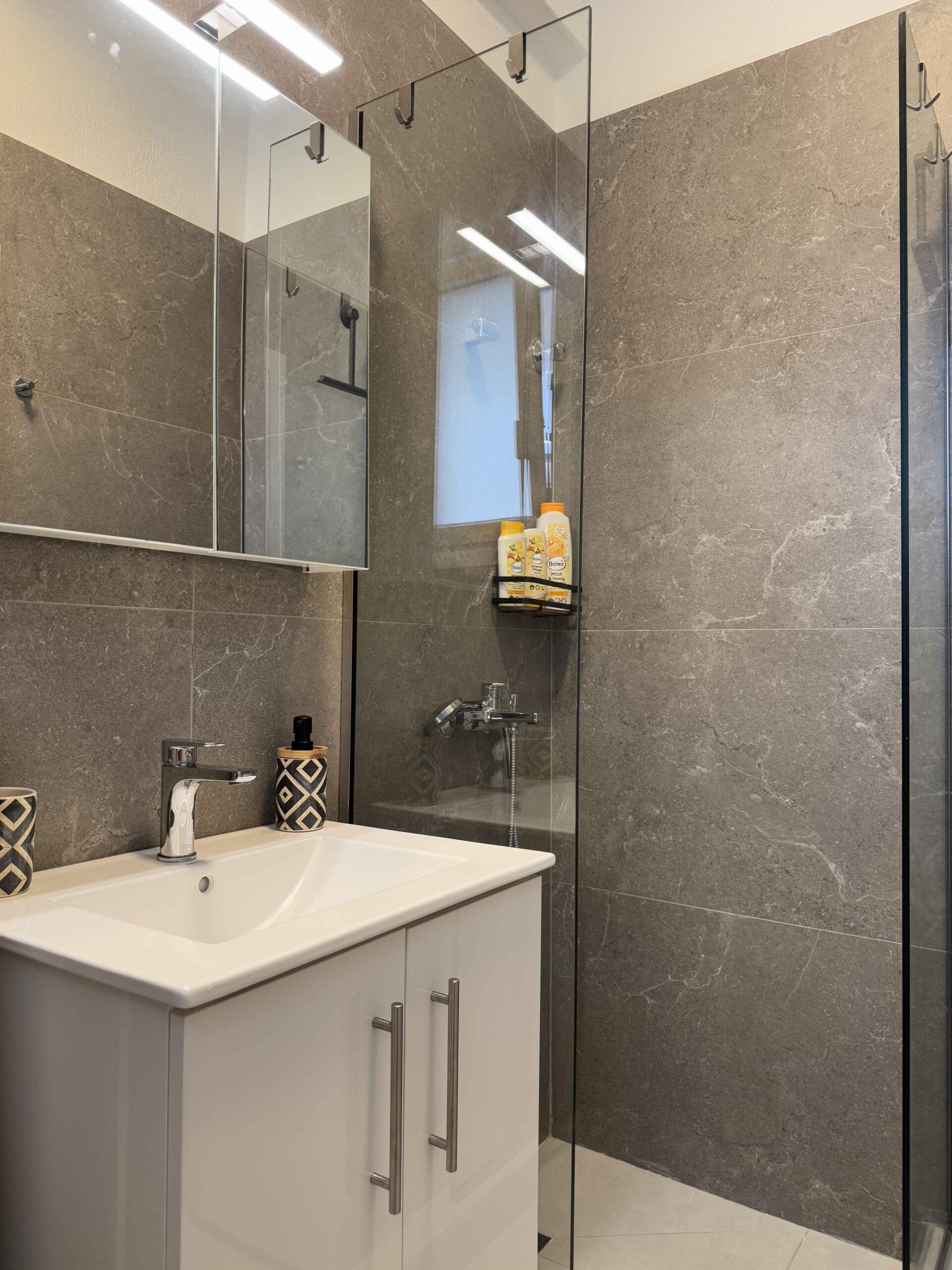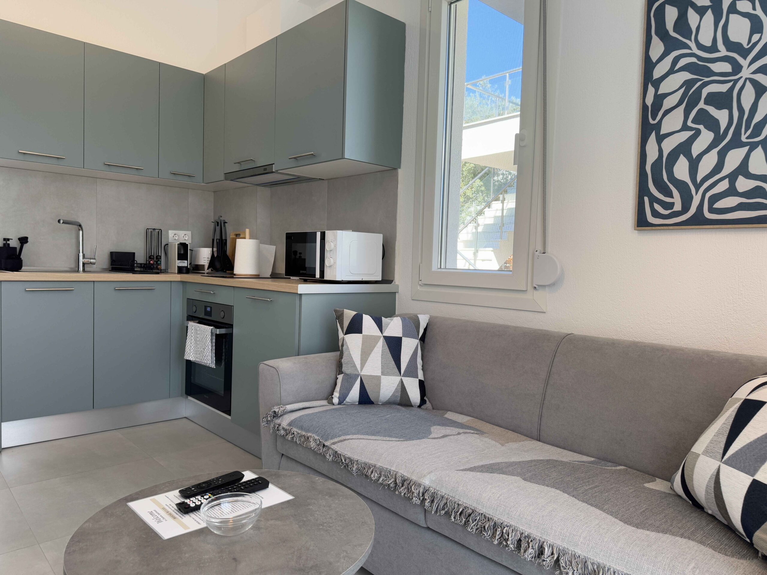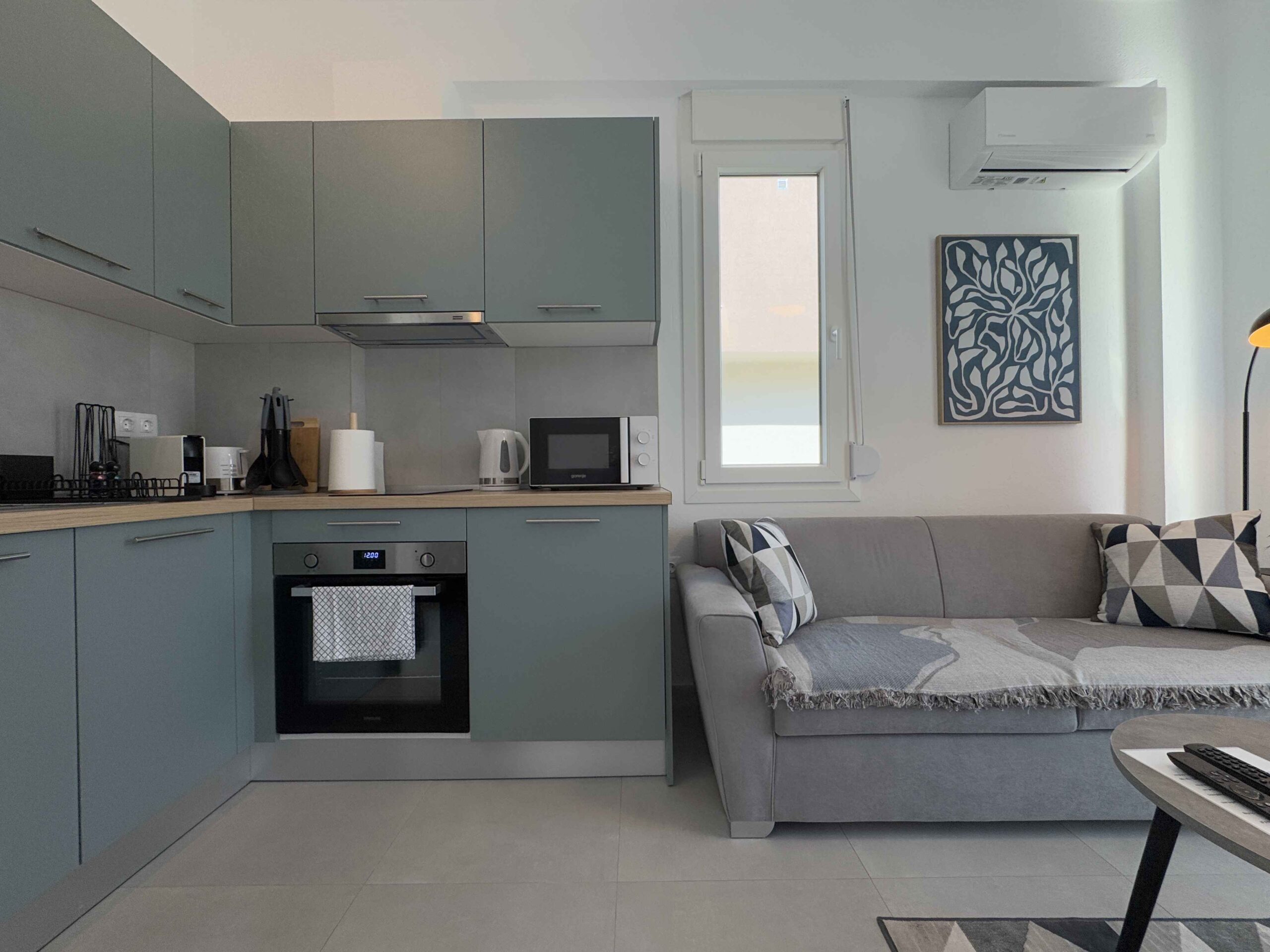 The apartment includes a comfortable living area, a fully equipped kitchen, and flexible sleeping arrangements. It works well for couples or small families and supports both short and longer stays.