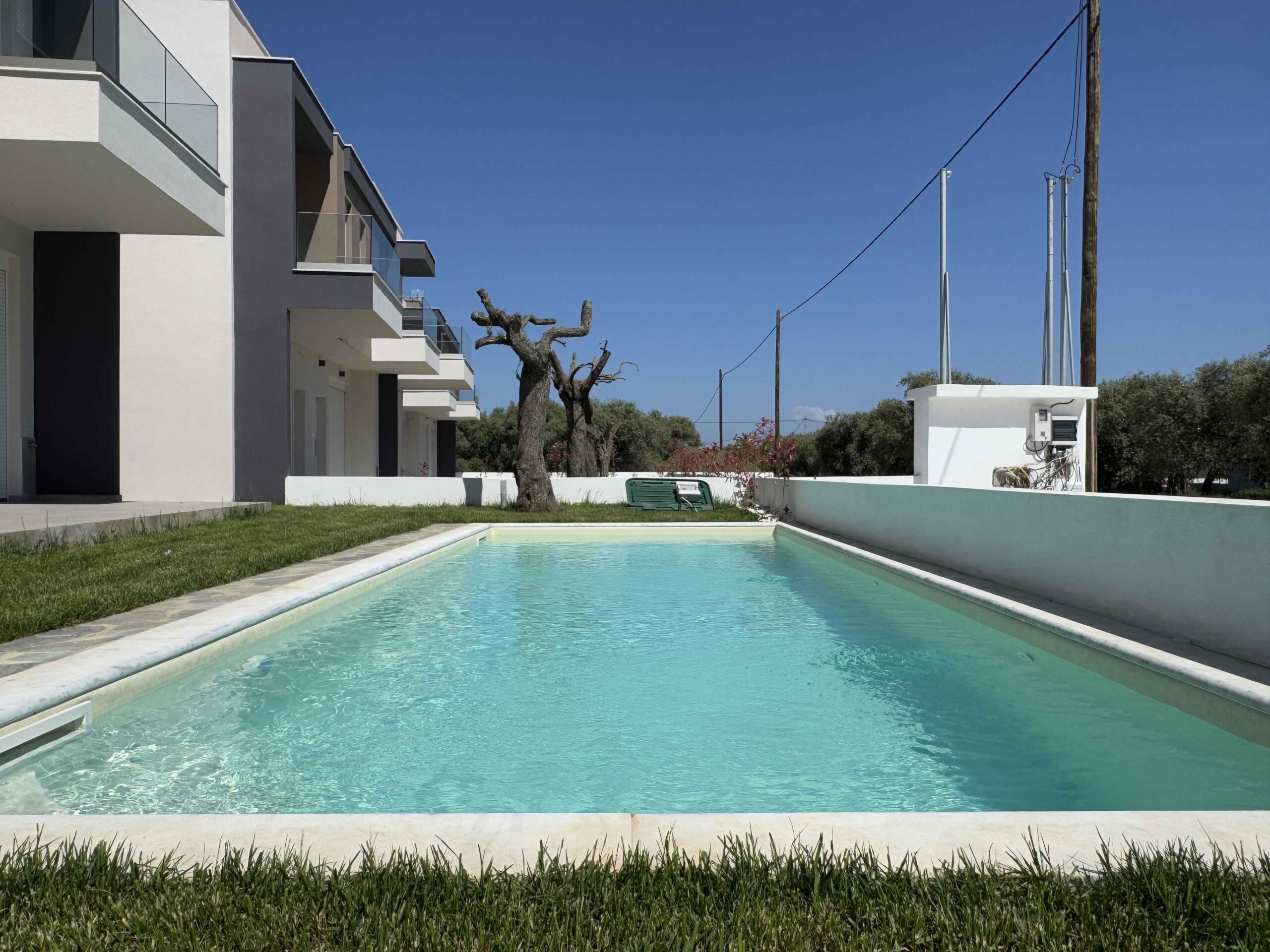 Guests have access to a shared swimming pool and garden areas within the complex. A private terrace provides additional outdoor space for everyday use, whether for meals or quiet time.