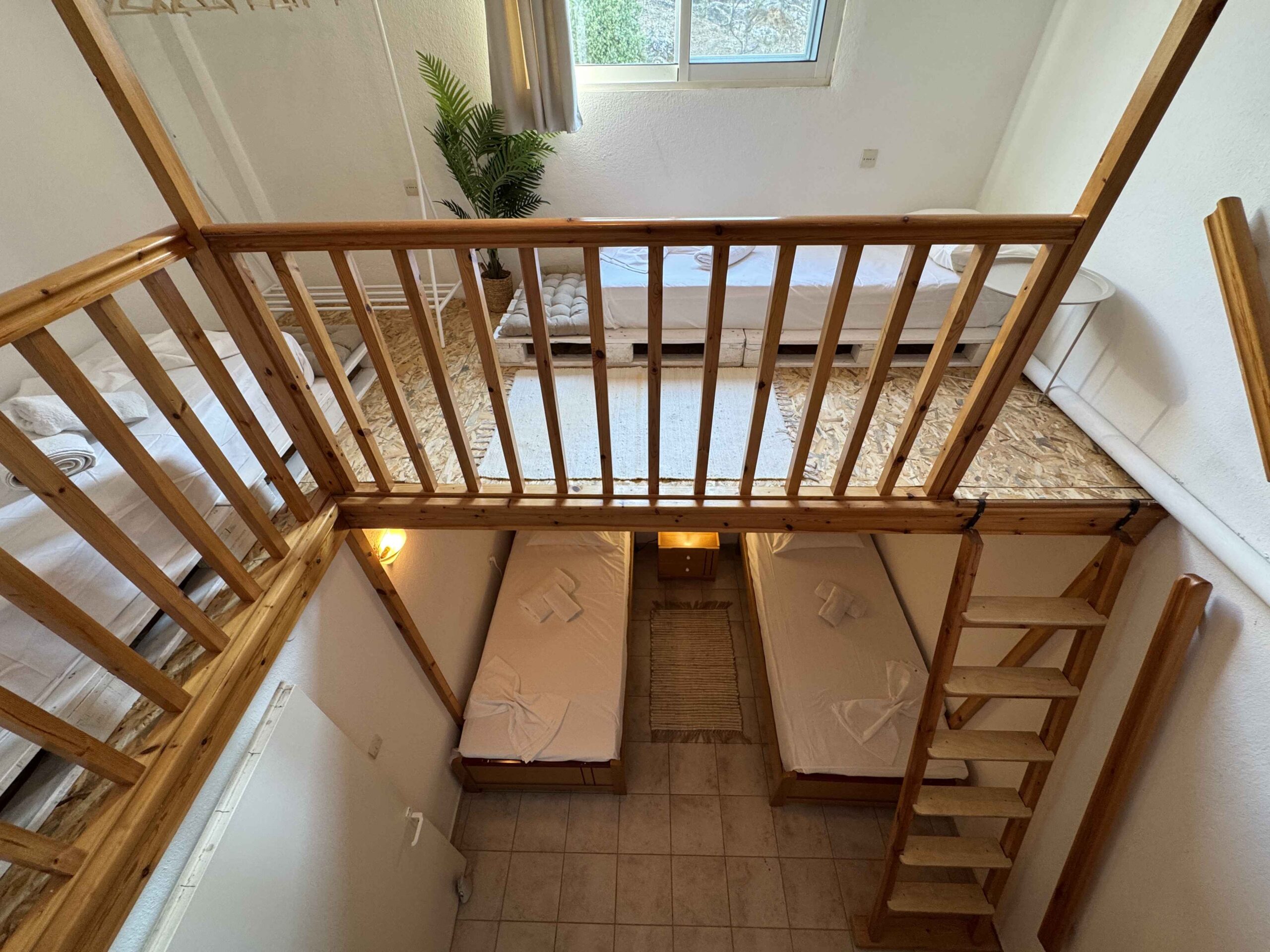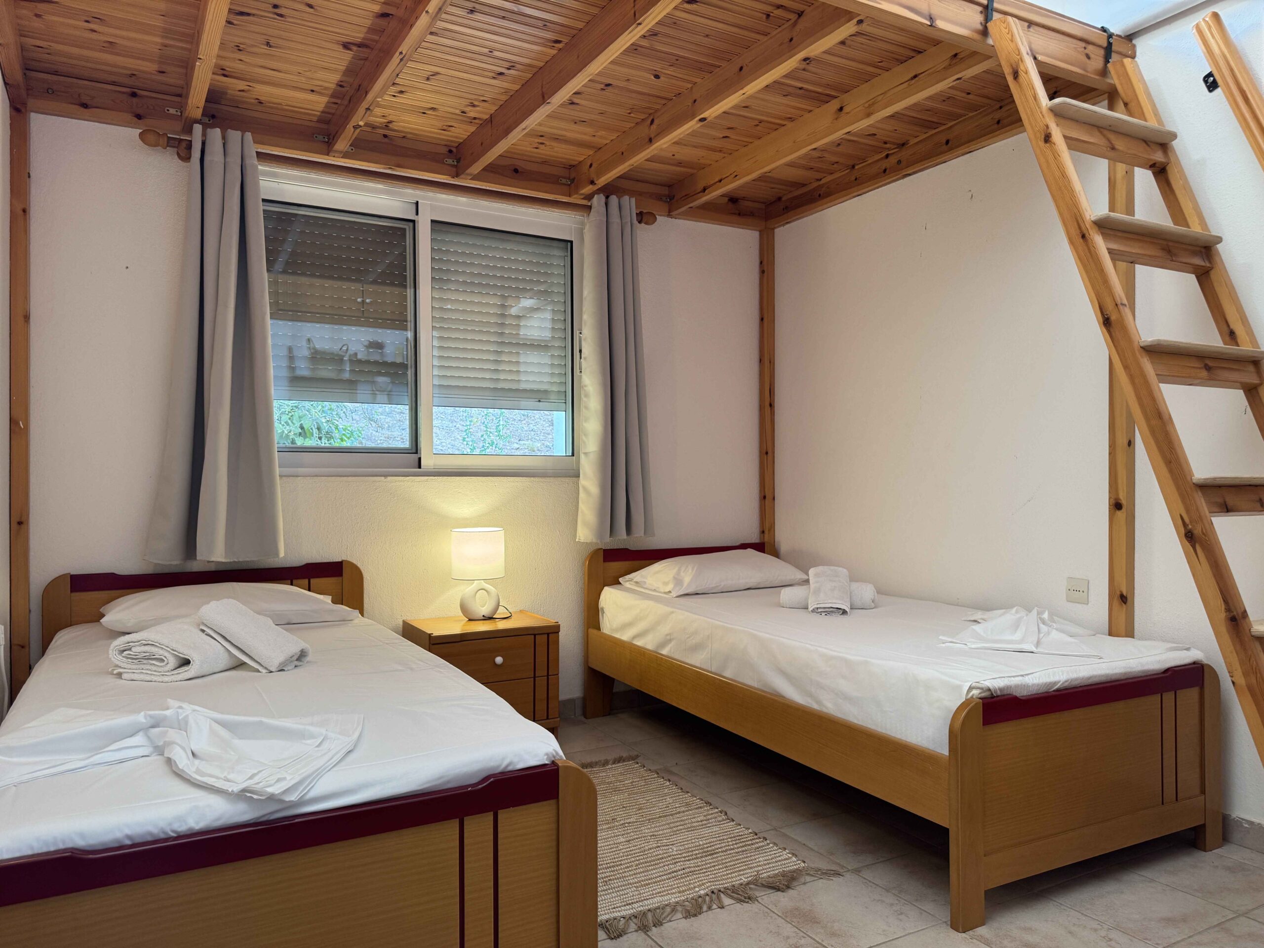The house includes one separate bedroom and a maisonette-style sleeping area arranged over two levels. Each level features single beds, making it a practical option for families with children or small groups. The layout allows sleeping areas to remain separate while maintaining a shared living space.